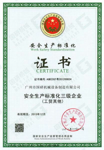 2012年12月24日,国家安全生产监督管理总局为华体会在线官网公司颁发了《安全生产标准化企业证书》,这意味着我司已达到《广州市工业企业安全生产标准化评定办法》及《广州市工业企业安全生产标准化评定标准》的要求。