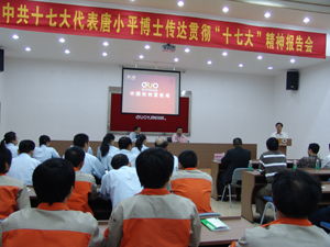 2007年11月14日下午3时,中共十七大代表唐小平博士前来我司宣讲十七大精神,活动在广州市华体会在线官网设备制造有限公司大会议厅举行,参加大会的有广州市天河区组织部、宣传部领导、珠吉街道党工委的领导同志们以及我司全体员工,广东电视台、广州日报等多家媒体派记者前来报道。大会由国研副总经理、党支部书记王声跃主持, 国研董事长、总经理王声位作了热情洋溢的讲话,介绍了华体会在线官网的发展规划以及党支部的建设情况。