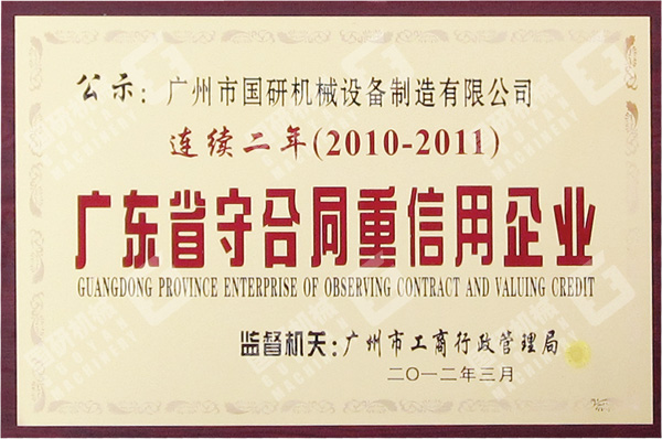 2012年3月,广州市华体会在线官网设备制造有限公司被评为2011年度“广东省守合同重信用企业”。这是我司继连续三年被评为“广州市守合同重信用企业”之后,连续两年获此殊荣。
